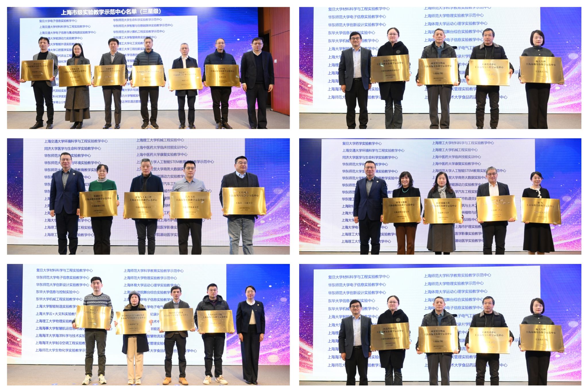 会上,赵震、汪小帆、刘庆生、舒静分别为三星级、二星级、培育级实验教学示范中心授牌并合影。