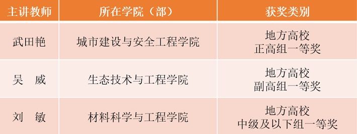 城市建设与安全工程学院武田艳、生态技术与工程学院吴威、材料科学与工程学院刘敏3位老师代表学校参赛,分别荣获地方高校正高组一等奖、地方高校副高组一等奖、地方高校中级及以下组一等奖。