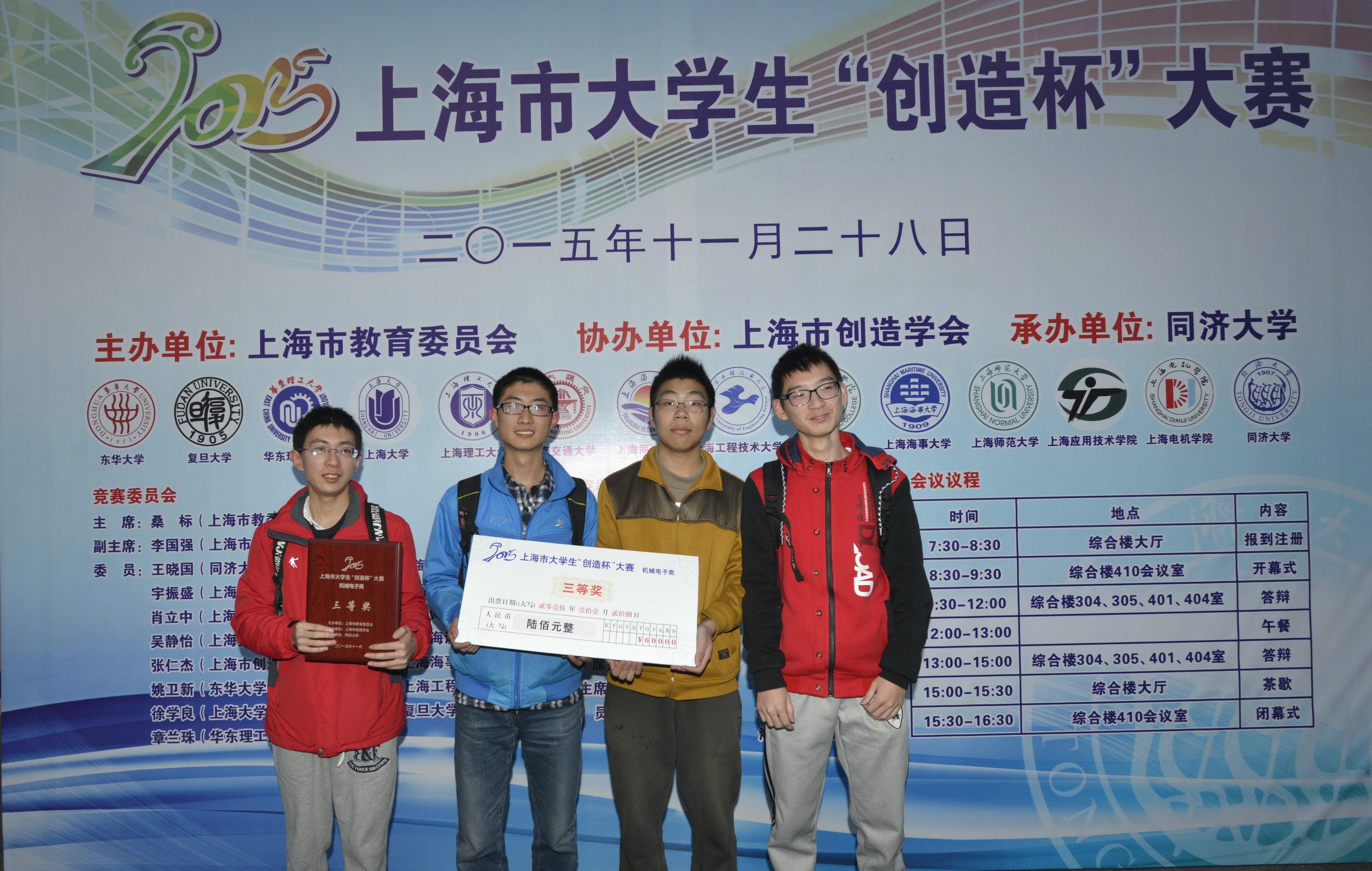 上海市大学生“创造杯”大赛至今已举行了九届,大赛由上海市教委主办、上海市创造学会协办,本届大赛由同济大学承办。大赛项目分土木交通与环境类、机械电子类、设计创意类,旨在培养学生崇尚科学,追求真知,勇于创新,敢于挑战的素质。通过大赛,同学们将实用性与社会热点相结合,力求作品能应用于实际生活,很好地提升了自身的动手实践能力与创新、创造能力。