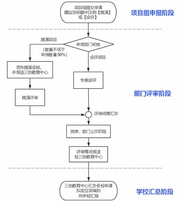 2026年3月25日前,请各学部(院)按流程(见附图1)组织项目评审,确定本部(院)推荐立项项目及推荐顺序,并将评审成绩(百分制)上传至“上海应用技术大学三创教育管理平台”,完成学部(院)审核。