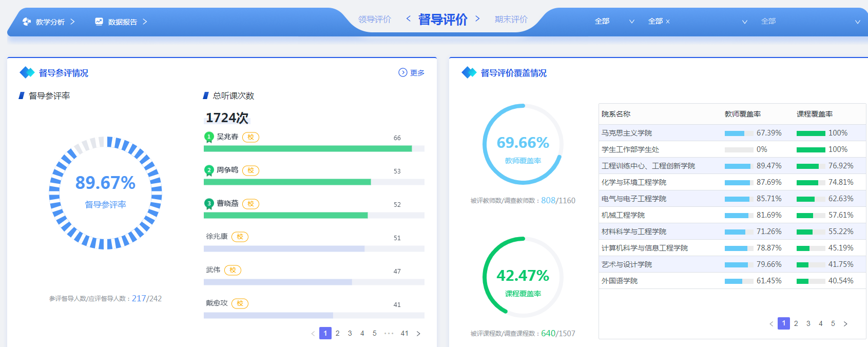 本学年高级职称教师承担的课程门数为1401,占总课程门数的61.45%;课程门次数为3267,占开课总门次的48.00%。