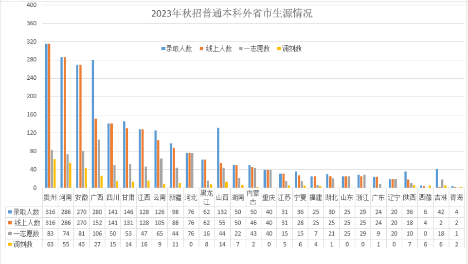 2023年,在党政领导的高度重视和二级学院及相关职能部门的大力支持下,我校顺利完成了各项招生任务,保障了2023年的生源质量。今年学校秋季招生外省市一本线(特招线)上人数共计2175人,占秋招本科外省市普通生源的87.53%,所有省份(含上海)一本线(特招线)上人数共计2229人,占全校秋招普通生源的60.8%。